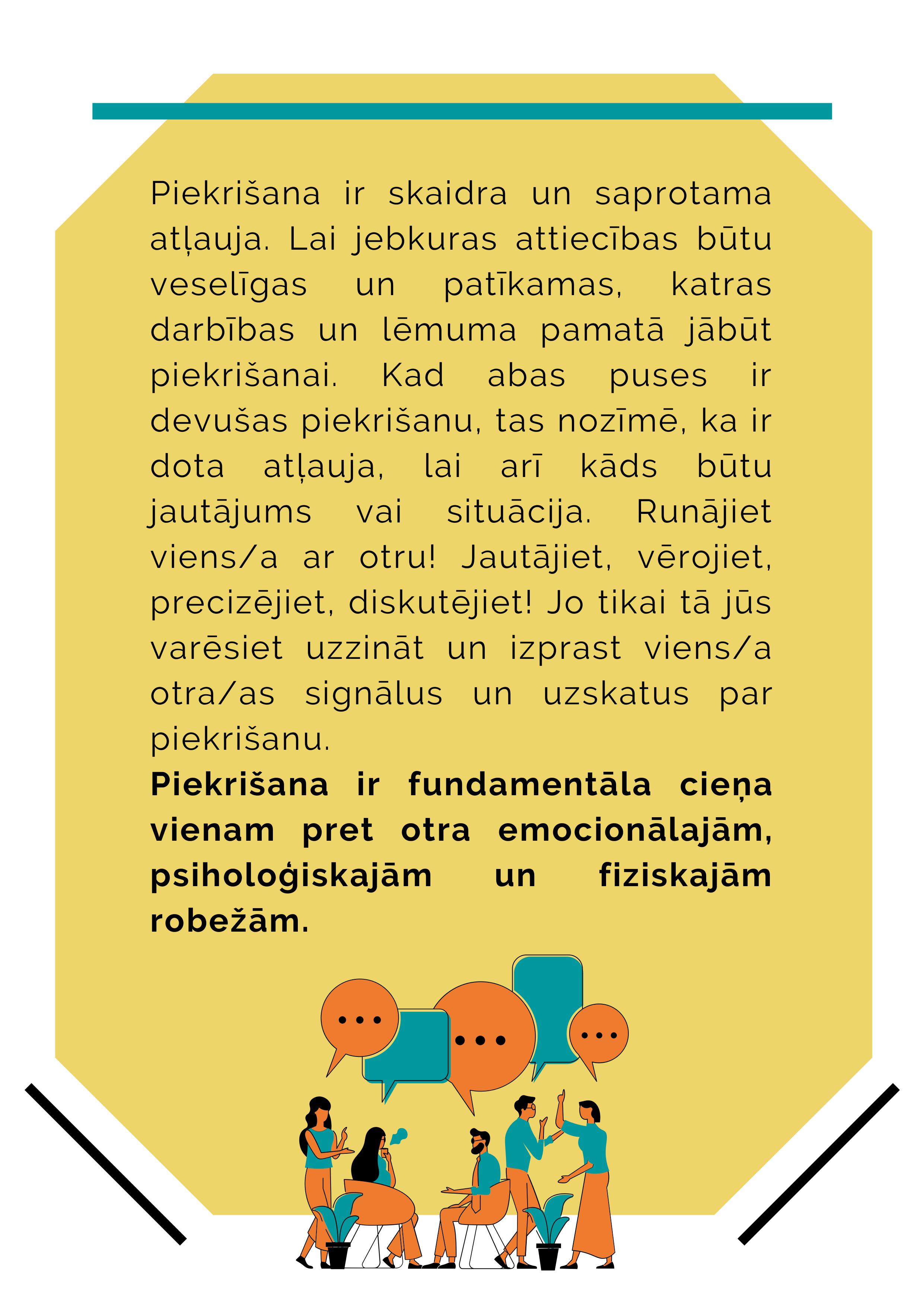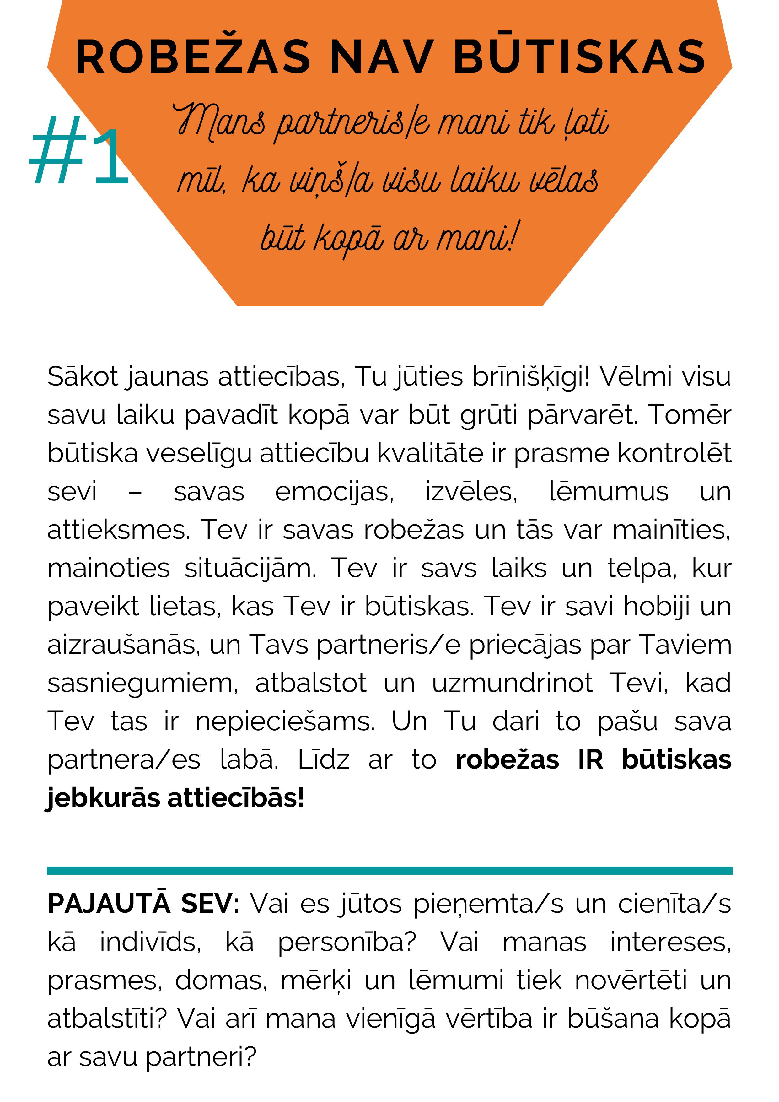 Robežas dažādās kultūrās un sabiedrībās ir atšķirīgas: vienā kultūrā pieņemts apskauties pat ar svešinieku, turpretī citā rokas spiediens jau ir “par daudz”. Tāpat izjūta par robežām var mainīties laikam ejot. Kas vakar man likās neērti, šodien jau var šķist pilnīgi OK. Un otrādi – kas pirms 10 minūtēm likās ērti un patīkami, nākamajā mirklī var izraisīt pilnīgi pretējas emocijas. Svarīgi ir atcerēties, ka tas ir PILNĪGI NORMĀLI! Mēs visi tā mēdzam justies un mums visiem ir jāmācās savas robežas apzināt un skaidri tās komunicēt ar citiem. Jo atklātāka/s un godīgāka/s Tu būsi pret sevi, jo veselīgākas attiecības ar citiem Tu varēsi izveidot. Un vēl atceries – komunicējot savas robežas, sakot “Nē” vai “Stop”, Tev nav jājūtas vainīgam/ai. Ja nejūties sadzirdēts/a un respektēts/a, pārdomā – vai šāda veida attiecības Tu vēlies turpināt.