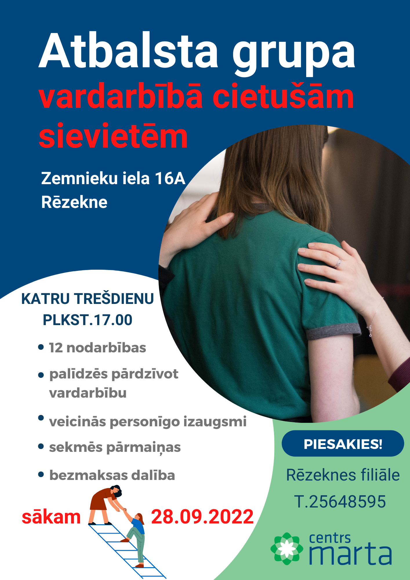 “Centrs MARTA” Rēzeknes filiāle aicina pieteikties dalībai atbalsta jeb pašpalīdzības grupā sievietes, kuras cietušas no vardarbības. Nodarbības plānotas no 28.septembra līdz 14.decembrim klātienē, Rēzeknē vai attālināti, platformā ZOOM. Nodarbību laikā būs iespēja saprast, kāpēc vardarbība ģimenē ir tik postoša, kā iespējams efektīvi tikt galā ar vardarbības sekām un kā nākotnē sevi pasargāt no vardarbības.