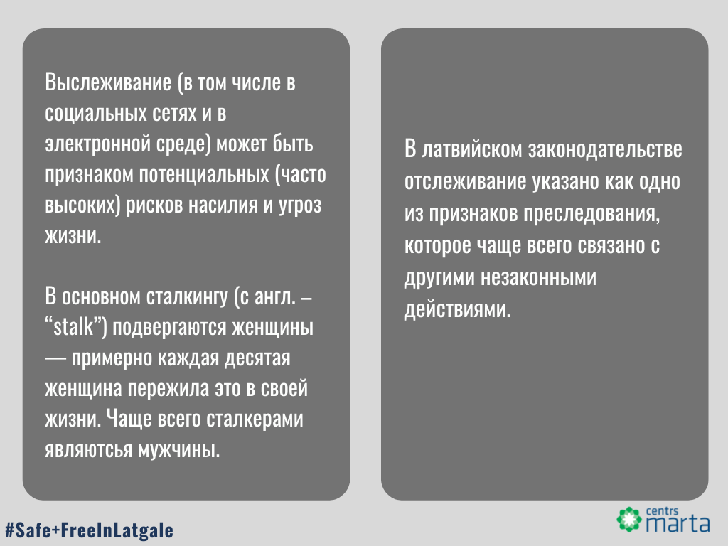 Выслеживание (в том числе в социальных сетях и в электронной среде) может быть признаком потенциальных (часто высоких) рисков насилия и угроз жизни. В основном сталкингу (с англ. – “stalk”) подвергаются женщины — примерно каждая десятая женщина пережила это в своей жизни. Чаще всего сталкерами являются мужчины. В латвийском законодательстве выслеживание указано как одно из признаков преследования, которое чаще всего связано с другими незаконными действиями. Выслеживание или преследование — это систематический и разнообразный набор действий, который создаёт жертве угрозу в течение определенного периода времени, порождая страх за свою безопасность или безопасность своих близких. Преследователь чаще всего знает свою жертву, и в большинстве случаев он является бывшим или нынешним партнером жертвы. Бывают и ситуации, когда жертвами преследования становятся известные личности. Чаще всего это вызвано маниакальными убеждениями, полученным романтическим отказом, нереалистичными фантазиями или отсутствием социальных навыков.